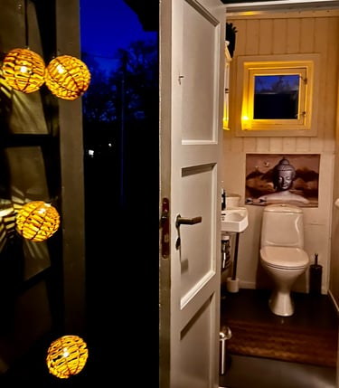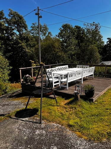 Det er do og dusj inne i tilknytning til hovedhuset. Bak hovedhuset er det en stor terrasse med plass til to familier rundt et bedre måltid.