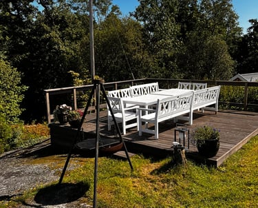 Hytta har mange terrasser for utendørs aktiviteter og samvær.